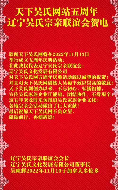 欣闻天下吴氏网将在2022年11月13举行成立五周年庆典活动:在此我仅代表辽宁吴氏宗亲联谊会:辽宁吴氏文化发展有限公司对天下吴氏网五周年庆典活动致以诚挚的祝贺!并且对天下吴氏网创始人吴蜀丰致以崇高的敬意!