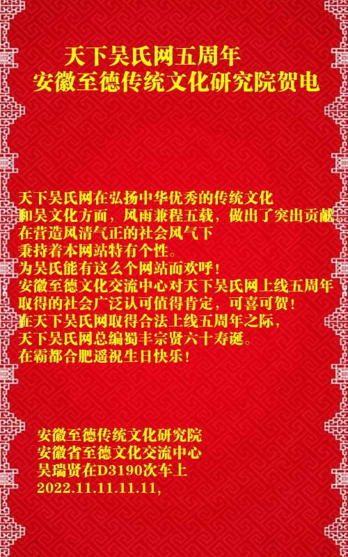天下吴氏网在弘扬中华优秀的传统文化和吴文化方面,风雨兼程五载,做出了突出贡献。在营造风清气正的社会风气下秉持着本网站特有个性。为吴氏能有这么个网站而欢呼!安徽至德文化交流中心对天下吴氏网上线五周年取得的社会广泛认可值得肯定,可喜可贺!在天下吴氏网上线五周年之际,天下吴氏网总编蜀丰宗贤六十寿诞。在霸都合肥遥祝生日快乐!