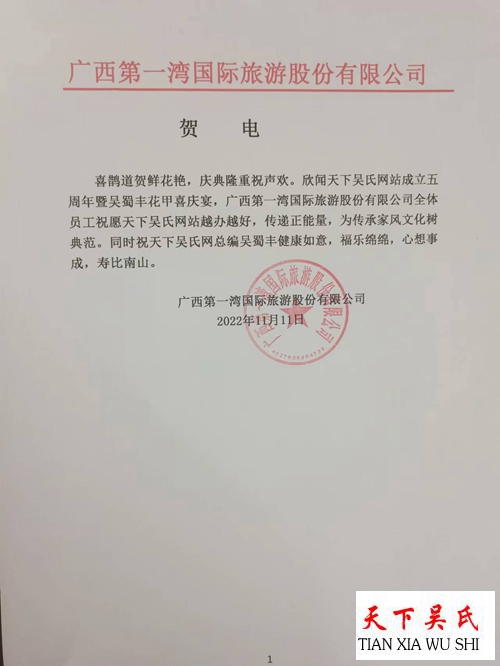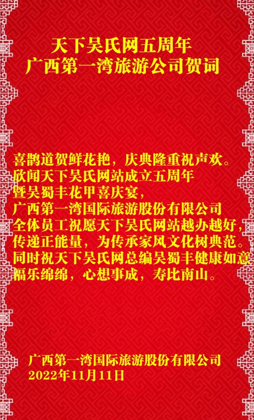 喜鹊道贺鲜花艳,庆典隆重祝声欢。欣闻天下吴氏网站成立五周年暨吴蜀丰花甲喜庆宴,广西第一湾国际旅游股份有限公司全体员工祝愿天下吴氏网站越办越好,传递正能量,为传承家风文化树典范。同时祝天下吴氏网总编吴蜀丰健康如意,福乐绵绵,心想事成,寿比南山。