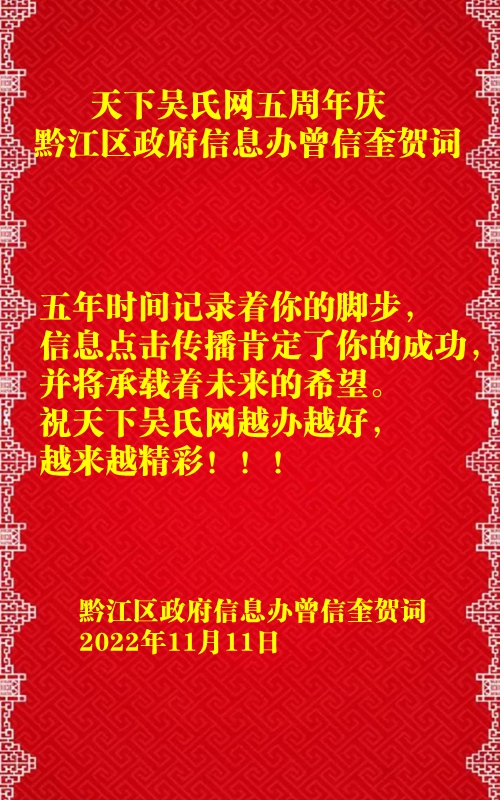 欣闻天下吴氏网贵网成立运营五周年又迎来了您的六十寿辰,在此,向你表示最衷心的祝贺祝福!