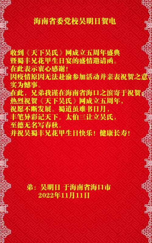 收到《天下吴氏》网成立五周年盛典暨蜀丰兄花甲生日宴的盛情邀请函。在此表示衷心感谢!因疫情原因无法赴渝参加活动并亲表祝贺之意,实为憾事。在此,兄弟我谨在海南省海口之滨寄于祝贺:热烈祝贺《天下吴氏》网成立五周年,祝愿不断发展。蜀道虽难书日月,丰笔异彩记天下。太伯三让立吴氏,至德无名写春秋。并祝吴蜀丰兄花甲生日快乐!健康长寿!