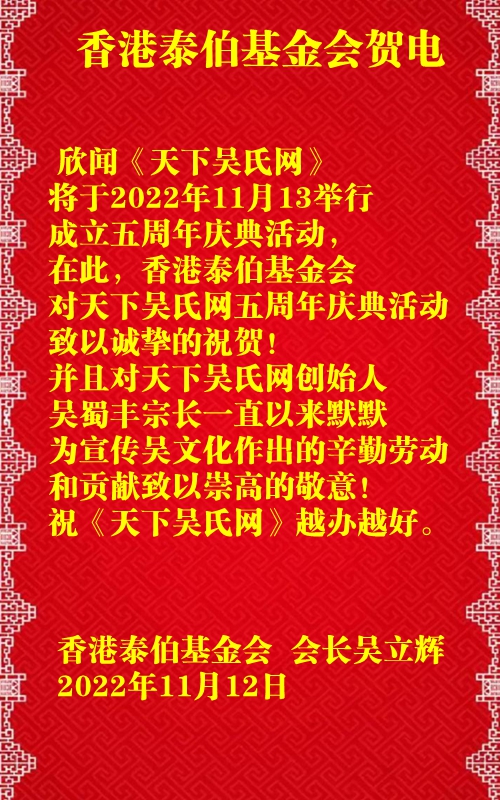 欣闻《天下吴氏网》将于2022年11月13举行成立五周年庆典活动,在此,香港泰伯基金会对天下吴氏网五周年庆典活动致以诚挚的祝贺!并且对天下吴氏网创始人吴蜀丰宗长一直以来默默为宣传吴文化作出的辛勤劳动和贡献致以崇高的敬意!祝《天下吴氏网》越办越好。