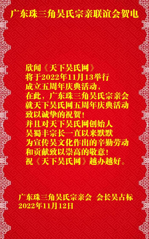欣闻《天下吴氏网》将于2022年11月13举行成立五周年庆典活动,在此,广东珠三角吴氏宗亲会对天下吴氏网五周年庆典活动致以诚挚的祝贺!并且对天下吴氏网创始人吴蜀丰宗长一直以来默默为宣传吴文化作出的辛勤劳动和贡献致以崇高的敬意!祝《天下吴氏网》越办越好。