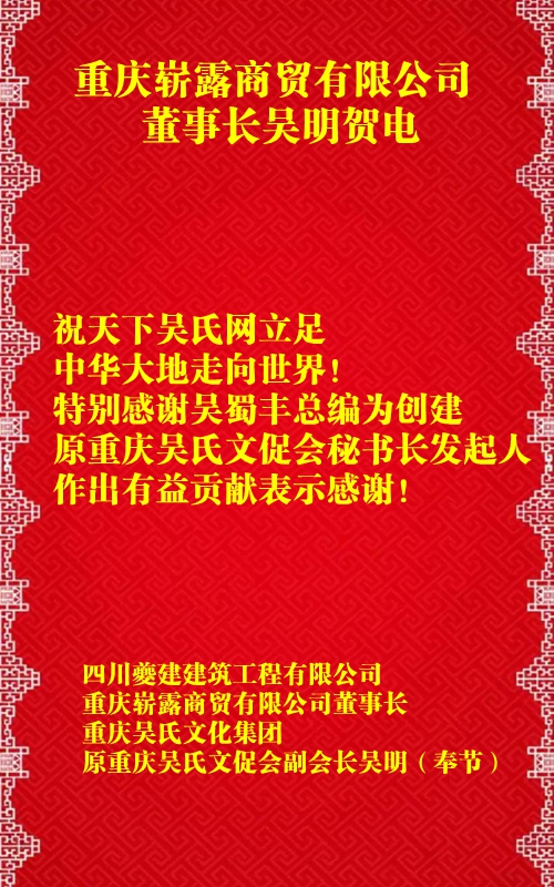 特别感谢吴蜀丰主编为创建重庆吴氏集团创立重庆吴氏文促会作出卓越贡献表示感谢!