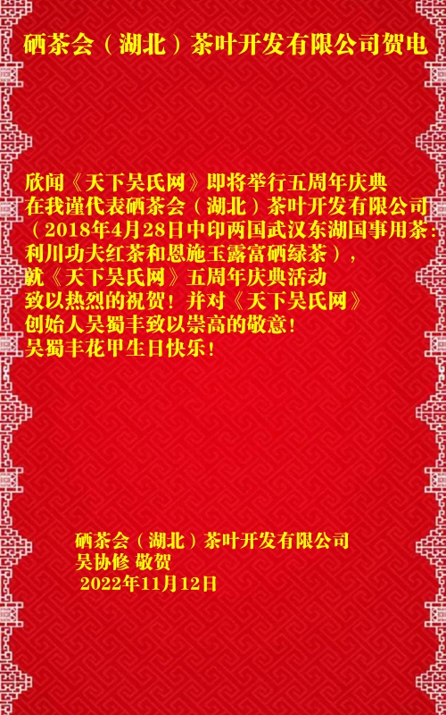 欣闻《天下吴氏网》即将举行五周年庆典,在此,我谨代表硒茶会(湖北)茶叶开发有限公司(2018年4月28日中印两国武汉东湖国事用茶:利川功夫红茶和恩施玉露富硒绿茶),就《天下吴氏网》五周年庆典活动致以热烈的祝贺!并对《天下吴氏网》创始人吴蜀丰致以崇高的敬意!吴蜀丰花甲生日快乐!