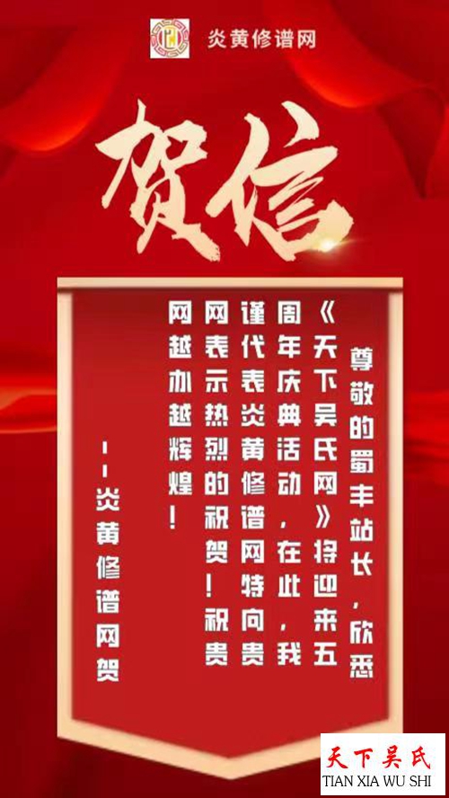 尊敬的蜀丰站长,欣悉天下吴氏网将迎来五周年庆典活动,在此,我谨代表炎黄修谱网特向贵网以表示热烈的祝贺!祝贵网越办越辉煌!