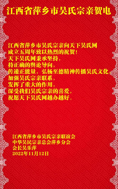 江西省萍乡市吴氏宗亲贺电