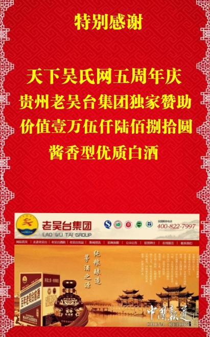 海桑田,转眼过去了很多年,当年的吴公老两口的后人已经遍布赤水河流域,他的子孙后代在全国和世界各地从事着各种行业,但无论怎样,他们忘不了家乡的美酒,于是,部分吴公后人再度传承祖业,酿酒手艺传承从未中断;随着历史的变迁,社会的发展,科技的进步,伴随着茅台镇千年古法酿酒技艺的日臻完善,如今,吴公后人-清华学子学强,通过不懈努力,将传统酿酒事业与国学文化精髓有机融合,另辟蹊径,赋予了美酒佳酿前所未有的生命力;经中华人民共和国国家工商行政管理总局商标局核准,吴氏美酒产品正式注册命名为----“老吴台”合法商标,吴氏美酒再次焕发出创新的活力,绽放出强劲有力的时代光彩!