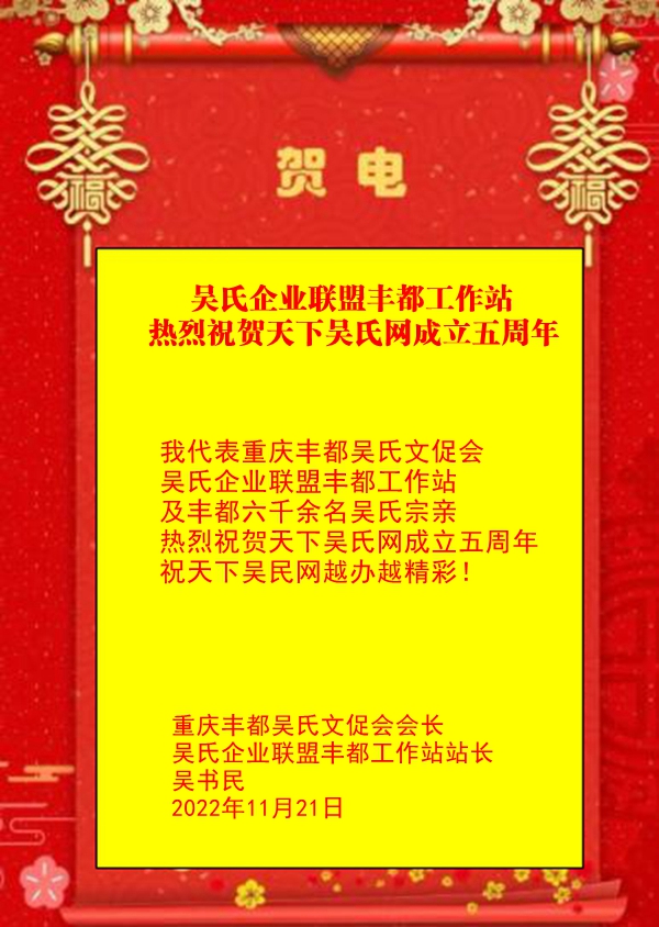 我代表重庆丰都吴氏文促会、吴氏企业联盟丰都工作站及丰都六千余名吴氏宗亲热烈祝贺天下吴氏网成立五周年!祝天下越办越精彩!