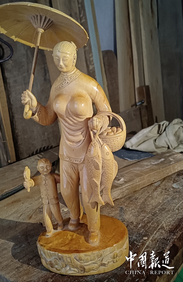 一幅活生生的木雕画引人注目,一位少妇右手举着遮阳伞,左手腕提着的小竹篮,里面装水果,同时腕挂两条鲤鱼,站在右边的一位男童身着唐装,深刻地彰显出一幅美好生活的画面。