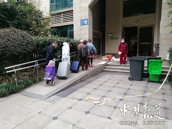 下午6点,我们进入恒大名都小区,刚走了几步,一个姓赵的女士便主动前来帮我们拉行李,看来她是本小区没有一分钱报酬的志愿者。紧接着又来了一位中年男士,一只手拖一个拉杆箱,一直把我们护送到家门口,我用手机拍摄下这动人的一幕。