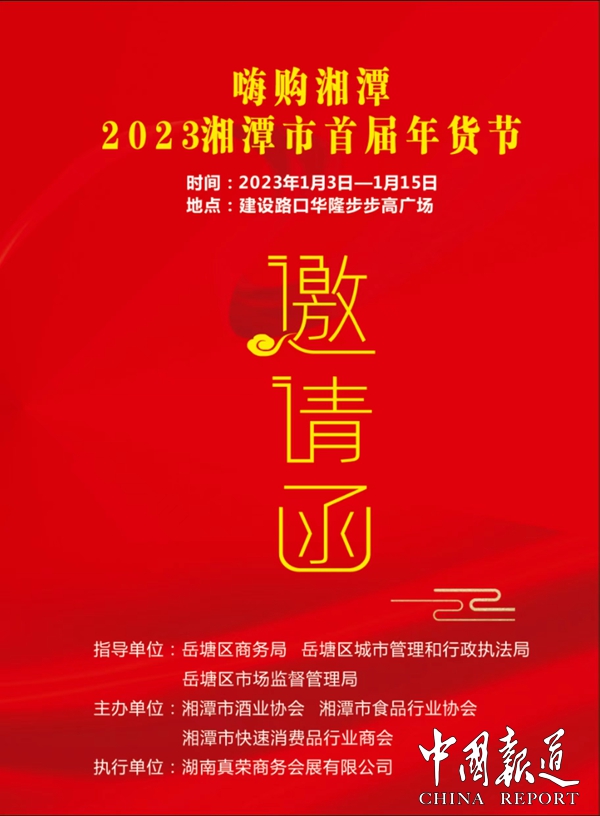 中国报道讯(吴蜀丰 通讯员丁劲松)由湖南湘潭市岳塘区商务局、湘潭市岳塘区城市管理和行政执法局、湘潭市岳塘区市场监督管理局为指导单位,湘潭市酒业协会、湘潭市食品行业协会、湘潭市快速消费品行业商会主办的“嗨购湘潭!湘潭市首届年货节” 将于2023年1月1日在湘潭建设路口步步高广场浓情开启!