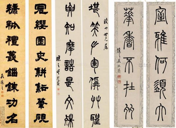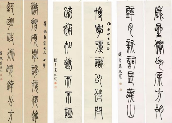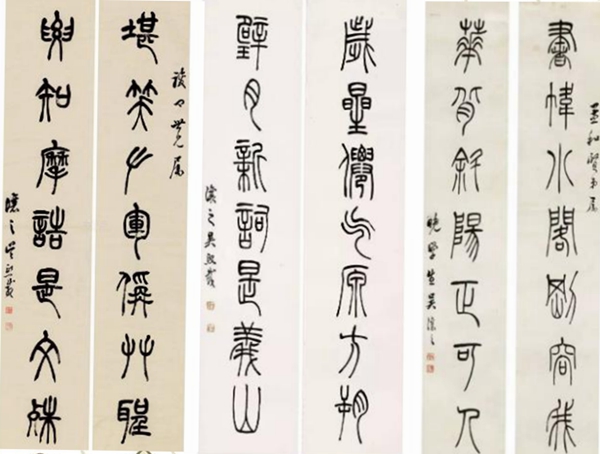 吴让之诸体皆擅,而篆隶功力尤深,特别是他的圆劲流美的小篆为世人所重。在篆法上,吴让之师法邓石如及汉篆法,更因其善于“铁笔写篆”撷取金石精华,故有“气贯长虹、刚劲有力、咄出新意”之态。包世臣对吴让之也有直接影响,他继承了包氏衣钵,恪守师法而自成面目,给人以清澹甜润之感。所书小篆《梁吴均与朱元思书》、《宋武帝与臧焘敕》、《三乐三忧帖》等,用笔浑融清健,篆法方圆互参,体势展蹙修长,有“吴带当风”之妙。吴让之隶书结体,中心紧敛而肢体舒展,颇富古意,被誉为清初以来篆隶书体创新者之一。其行书动势显著,生发了流动、通畅之气,单字虽隔,然意气绵延不断;楷书苍厚郁茂,俊逸爽劲,并掺有北碑意韵,一扫“馆阁体”纤弱之风。