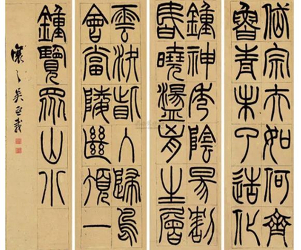 吴昌硕评曰:“让翁平生固服膺完白,而于秦汉印玺探讨极深,故刀法圆转,无纤曼之气,气象骏迈,质而不滞。余尝语人:学完白不若取径于让翁。”吴煕载,他长期寓居扬州,以卖书画刻印为生,晚年落魄穷困,栖身寺庙借僧房鬻书,潦倒而终。吴煕载是包世臣的入室弟子。其行草学包世臣,篆隶及篆刻则师法邓石如。尤其是篆刻,不仅自成面目,而且进一步完善了邓派印风,后来学邓派印者,多从吴让之入手。吴煕载以篆书和隶书最为知名。其篆书点画舒展飘逸,结体瘦长疏朗,行笔稳健流畅。古朴虽不及邓石如,而灵动典雅似则过之,颇具妩媚优雅之趣,在晚清书坛享有很高的声誉。对后来的赵之谦吴昌硕均有影响。
