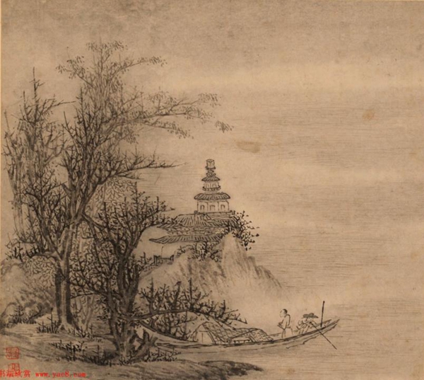 吴宏 江城秋访图 绢本设色 160.8×78.2厘米 旅顺博物馆【名称】清 吴宏 江城秋访图【年代】清代【简介】立轴,绢本,设色,纵160.8厘米,横78.2厘米,旅顺博物馆藏。此图以中锋写树木、房屋、舟楫、人物;以侧锋皴山石。水墨烘染,明暗向背自成,水光云气自生,颇有生意。略施淡彩,色调和谐而又明快清爽,具有典型的“浅绛”风格。画面自题“摹李营丘墨法于响雪庵中”。