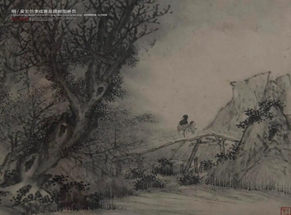 负郭村居图 立轴绢本吗天津艺术博物馆藏此图远景绘高山耸立,层峦叠翠,山脚下陈林杂树,院落村舍其间,山道小径,有人负薪而归。中间茅棚草地溪水,林间牧牛缓步,神态跃然。近景古树老枝,水阁茅棚,溪流有声,引人入胜。布局严谨,运笔劲逸,境界幽奥,又有生活气息。小山远歌图 长卷 纸本 上海博物馆藏 款识:云渺渺,水溟溟。高树低树连阴密,远山近山无数青。中有高人抱幽独,坐卧烟霞隔尘俗。瑶琴一曲来宫商,俯仰乾坤心自足。吴宏。此图绘参天老树,枝槎纵横老健,溪水沿山蜿蜒潺流,树丛茅屋书斋深藏;平坦处,一老者抱琴席地而坐,面山临水高童子身后侍立。笔情墨韵与诗情画意尽在其中。这是一幅淡设色人物山水画,纸本长卷。画幅中部,画着高低、大小不等的老树,环溪而生,枝繁叶茂,连成密密树阴。右部“峰峦郁密”,笔墨苍润,茅屋书斋掩映于树丛中。溪水蜿蜒而出,溪边平坦处有一位老人正面对远山,抱琴独坐,一童拄杖立于老人身后随侍。人物用勾线填色法画成,线条劲细流利,神态悠闲,处于全图的中心,醒目突出。远处,云叆叆,水渺杳,云水迷蒙,一派空灵,老人奏琴高歌,歌声和着水声,传到远处去。