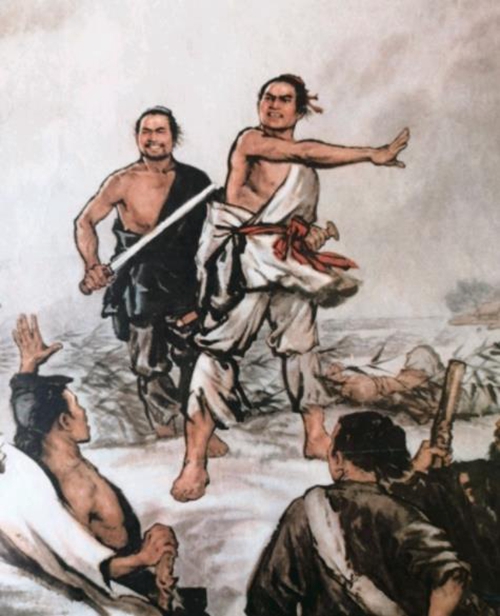 吴广见时机基本成熟,于是趁两个押送士卒的军官喝醉,故意扬言逃跑,以激怒押送他们赴边的将尉。喝得醉醺醺的两个将尉果然大怒,责骂和鞭打吴广,引起士兵们不满,群起而哄之。吴广奋起夺下一名将尉佩剑将其杀死,陈胜也乘势杀了另外一名将尉。随后,陈胜把900名戎卒召集在一起,大声说道:“我们在这里遇上了大雨,已不能按期抵达渔阳了,而误了期限大家都要被斩杀,即便侥幸不被砍头,戍守边塞十分之六七的人也要送命。再说好汉不死便罢,要死就要取得大名声啊!王侯将相难道有天生的贵种吗?“