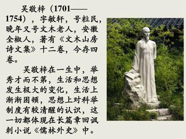 吴敬梓精熟《昭明文选》,工诗词散文,诗赋援笔立成。著有《儒林外史》、《文木山房诗文集》十二卷(今存四卷)、《文木山房诗说》七卷(今存四十三则)。 (概述图吴敬梓铜像来自全椒吴敬梓纪念馆)