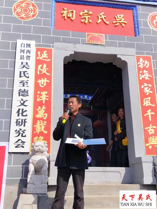 天下吴氏网讯(吴世锋陕西白河报道)1月14日,陕西省白河县四新村延陵吴氏祠堂百多人,举行了祭祖团年活动,本次活动由吴世平、吴经春主持,白河县吴氏宗亲联谊会长吴昊、冷水镇驻村领导吴经刚、四新村支部书记李刚、白河县吴氏至德文化研究会执行会长吴世平、陕西省渭南市高级中学校长现援藏领导成员吴波,还有现就读大学生吴旭阳先后发言。