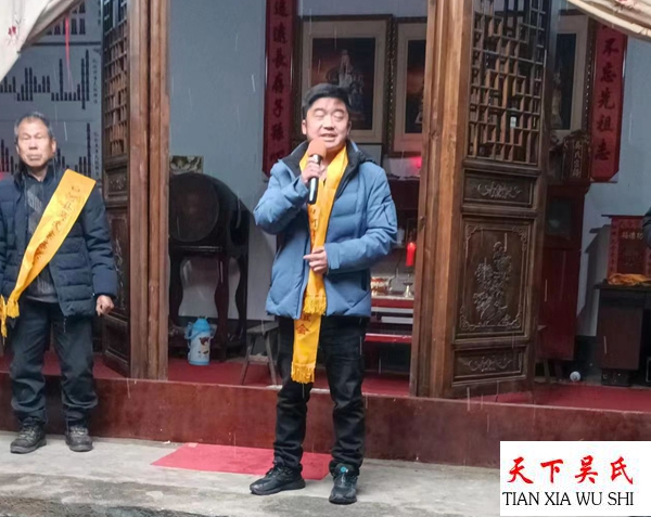 吴庸公二房的吴经刚在发言中说,今天,我们吴氏家族在咱们祠堂隆重祭奠我们的祖先,追忆先人的丰功伟绩,联谊吴氏家族的亲情友情,共谋吴氏家族的发展大业,我感到无比的自豪和荣幸。