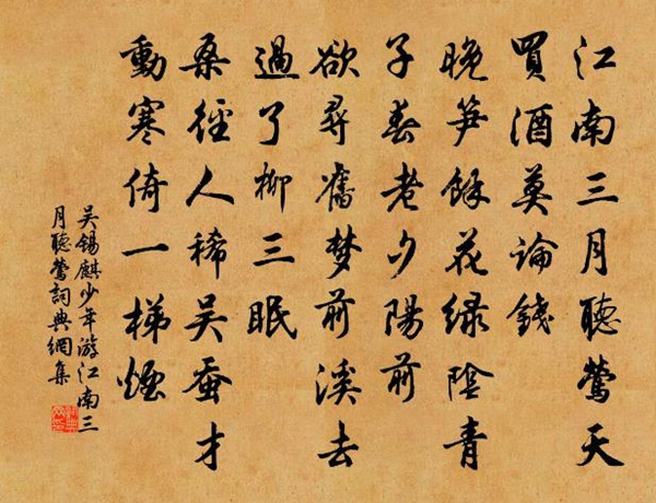 吴锡麒 能诗,尤工倚声,诗笔清淡秀丽,古体有时藻采丰赡,代表作如《双忠祠》《凤凰山怀古》《观夜潮》《读放翁集》等。在浙派诗人中,能继朱(彝尊)、杭(世骏)、厉(鹗)之后,自成一家。亦能词,但不如其诗和骈体文的著名。吴锡麒骈文颇著称,晚年登门求诗者,络绎不绝。 [2] 兼工书法,尤其擅长行书、楷书。代表作如《务本论》《岳飞论》《与袁简斋前辈书》《苏文忠公诗合注序》《湖心泛月记》等。吴锡麒的书法作品为中华人民共和国国家文物局公布为“精品和各时期代表作品不准出境者”。
