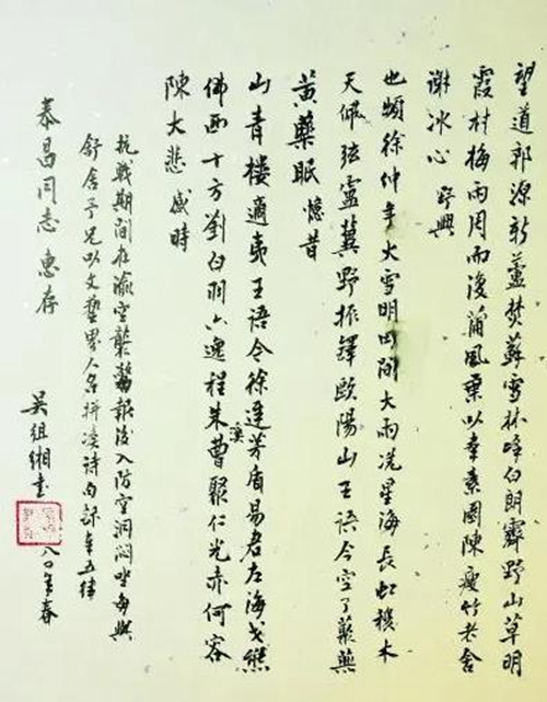 夫人伴读 吴组缃上中学时就结了婚,在清华大学上学时把家眷也带了来。他家住在西柳村,季羡林李长之常去那里看他们。季羡林后来还说,现在听说中国留学生可以带夫人出国,名曰伴读,吴组缃的所为不正是“伴读”吗?真可谓“超前”了。那时,吴组缃有一个女孩,小名叫小鸠子。李长之《孩子的礼赞——赠组缃女孩小鸠子》的文章提到“现在在一起的孩子们中,我得益顶多的,又彼此知道姓名的,是小鸠子。也许是我锐感或过敏,这孩子和我颇有交情。孩子们的爸爸组缃,真是如我们几个朋友所加的‘徽号’,是一位感伤主义者,他看一件什么事物,无往而没有感伤的色彩。连他的声调也是感伤主义的,虽然在锐利的幽默中,甚而哪怕是讥笑的态度,也有怜悯的伤感的同情在。他的夫人和孩子刚来北平不久,他曾向我介绍过他的孩子,据说是非常想家,常模仿在家里的祖母想她的光景,而且还感到孤寂,因为那时还没有在一块玩的小孩子,孩子才多大呢,不过6岁。我心里想,组缃的话是不能不承认的,因为有他这样伤感的爸爸,孩子难以不伤感,而且纵然不伤感,由感伤主义者的爸爸看去,也会伤感了的”。
