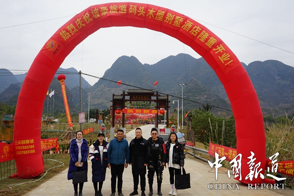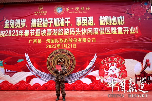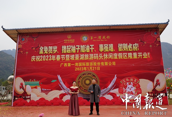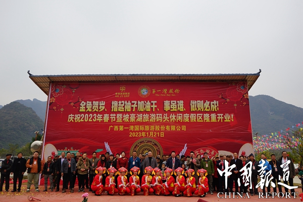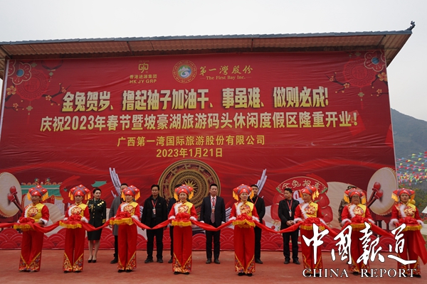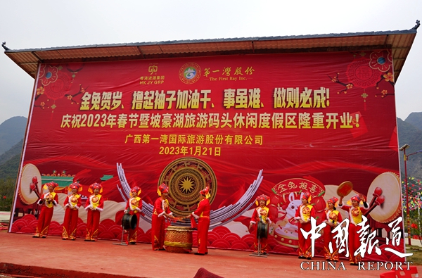 中国报道讯(通讯员  岑福山 覃 源)2023年大年三十日上午,广西第一湾国际旅游股份有限公司东兰县红水河坡豪旅游码头景区,彩旗飘扬,歌声嘹亮,人头攒动,因疫情原因沉寂了三年的坡豪旅游码头名胜风景区沸腾了,人们奔走相告,第一湾公司木屋别墅酒店竣工对外开放庆典活动在这里隆重举行,即日起接受全年预定。