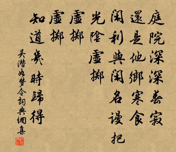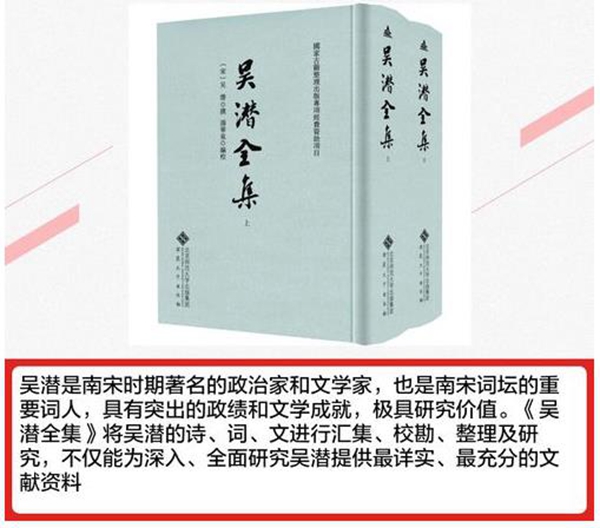 吴潜为南宋中晚期名臣,出任地方、朝廷要员时均颇有建树。其亦工词,词风近于辛弃疾,多抒发济时忧国的抱负与报国无门的悲愤。格调沉郁,感慨特深。著有《履斋遗集》,词集有《履斋诗余》。
