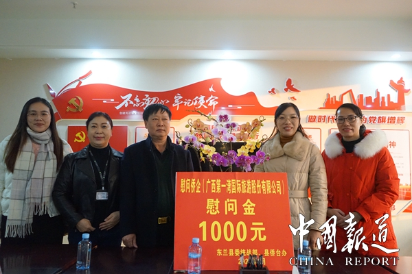 中国报道讯(通讯员 岑福山 覃 源 麦国新)1月31日,中共东兰县委常委、统战部长韦彩秀、副部长吴雪梅走访慰问民营企业广西第一湾国际旅游股份有限公司,与公司班子成员座谈交流,给公司带来了慰问金、东兰君兰花、饮料等慰问品,送来了新春的问候和祝福。