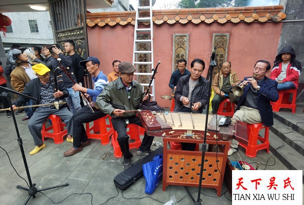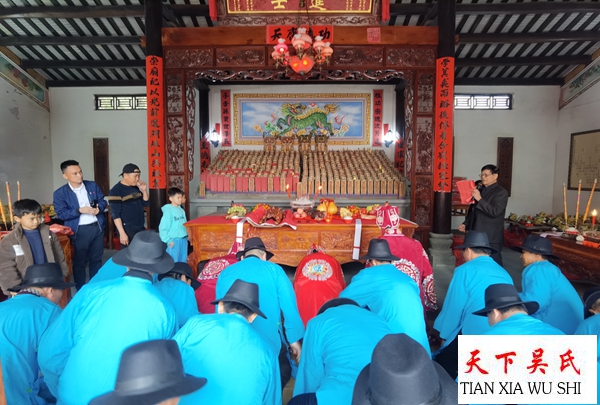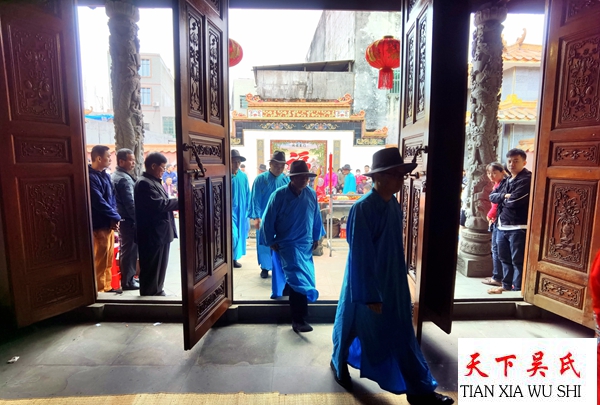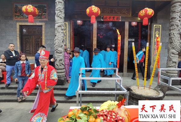 当天下午1点吴氏祠堂灯火辉煌,香炷的柱台燃烧着祥和的晶莹烟云,祖先神牌前中间、两侧,整整齐齐地排放着各支丁的供奉祭品。祠堂里尽显对祖先敬仰恩德氛围。祠堂前,八音乐队吹打起悦耳动听的民乐,在鞭炮声声中共鸣。主祭师带有蕴意的口语颂读叩拜祝文,主祭,陪祭行礼仪,场面庄严肃穆。随着向祖先行礼献猪、献鸡、献鱼、献水果、献酒等祭拜活动在炮竹声声中结束。