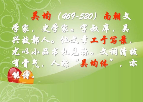 吴均生于宋明帝泰始五年(469),卒于梁武帝普通元年(520)。南朝梁时期的文学家。好学有俊才,其诗文深受沈约的称赞。其诗清新,且多为反映社会现实之作。其文工于写景,诗文自成一家,常描写山水景物,称为“吴均体”,开创一代诗风。梁武帝天监初年,为郡主簿。天监六年(506年),被建安王萧伟引为记室。临川王萧宏将他推荐给武帝,很受欣赏。后又被任为奉朝请(一种闲职文官)。欲撰《齐书》,求借齐起居注及群臣行状,武帝不许,于是私撰《齐春秋》,称梁武帝为齐明帝佐命之臣,触犯武帝,书焚,并被免职。不久奉旨撰写《通史》,未及成书即去世。 卒于普通元年(520年),时年五十二岁。吴均既是历史学家,著《齐春秋》三十卷、注《后汉书》九十卷等;又是著名的文学家,有《吴均集》二十卷,可惜已亡佚。