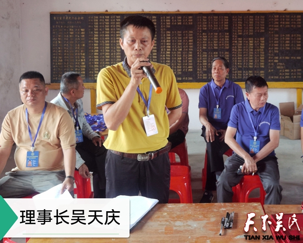 会议由吴崇胜主持。在奏唱国歌后,吴清良宣布2月9日第一次理事会议提名的理事候选人名单。按会议议程,通过举手表决一致通过,选举产生了第二届理事会、监事会。吴天庆当选理事长,吴崇胜当选监事长,吴清良当选常务副理事长,吴育辉、吴钟天当选副理事长,聘任吴昊为秘书长,顾问及70名宗亲为理事。