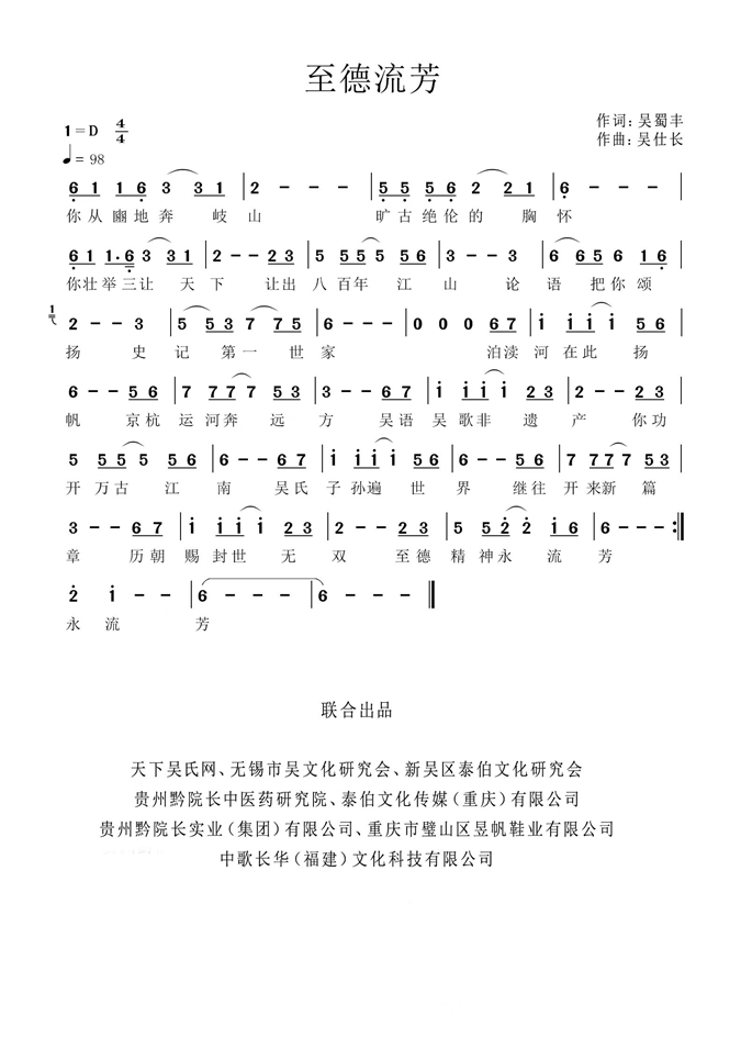 据介绍,耗时长达二年时间的创作,歌词从二段增加到三段,又从三段删减到二段,第一次谱曲完成后又第二次谱曲,经68种乐器合声组合,替换数名歌手演唱,最后进入录音棚制作而成的《至德流芳》原创歌曲终于正式上线了。关于歌名,经多次广泛征求意见,最终由著名实力派歌手龚丹倾情演唱《至德流芳》。