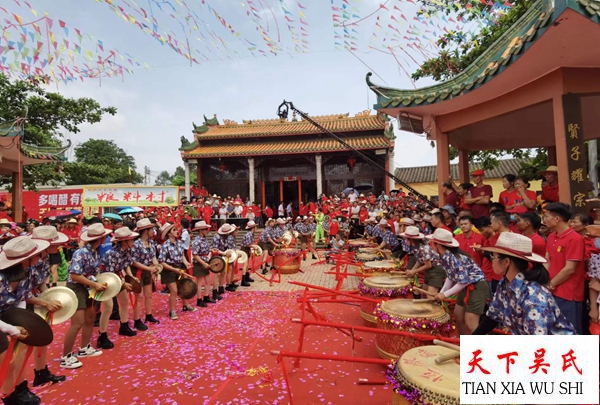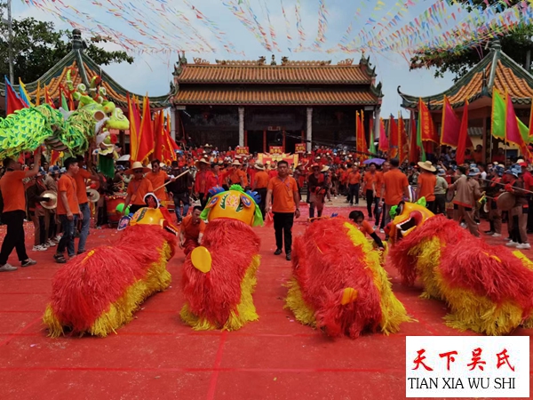 上午九点,被邀请庆典活动的26个纯吴姓村庄的代表仗人丈队,各式的彩车精制形象,猛龙舞动,瑞狮跳桩,威风锣鼓,彩旗飘飘,地方调声婀娜多姿,共有约2万多人参加拜谱典礼。庆贺仪式精彩纷呈,随着敲锣打鼓,声声悅耳,使人心情进奋。