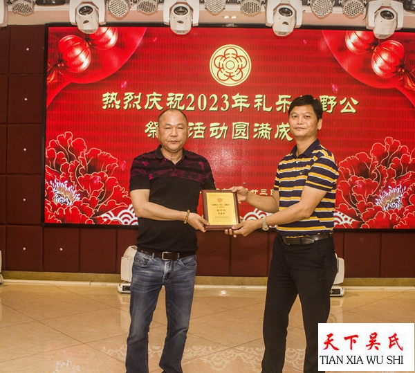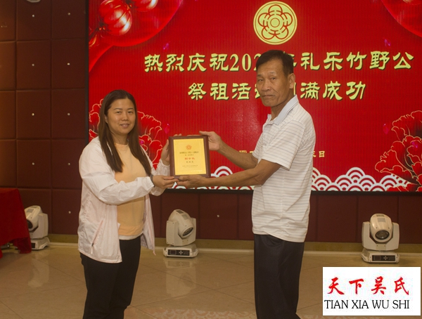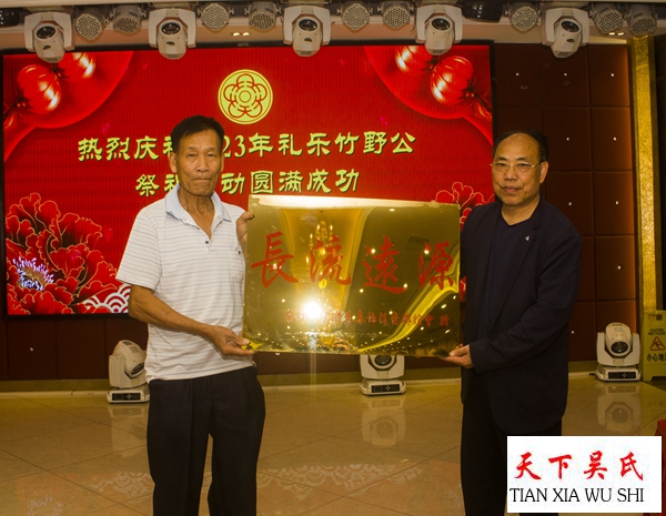 南雄珠玑巷泰伯后裔联谊会吴峰会长赠送(源远流长)牌匾祝礼乐吴氏竹野公联谊会弘扬吴氏美德,发扬吴氏优良传统,代代相传。新会大鳌吴氏宗亲会会长吴胜桥,祝礼乐吴竹野公联谊会祭祖圆满成功,将新会大鳌吴氏兄弟和礼乐吴氏兄弟团结一致,发扬光大吴氏家族的传统美德让尊老,敬老,助老美德万代万代传。祝大家身体健康,万事如意。