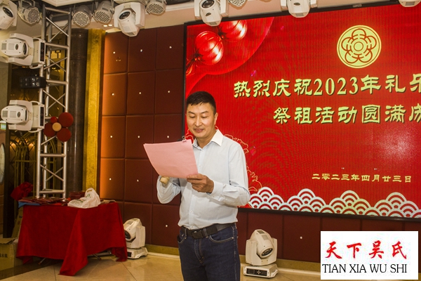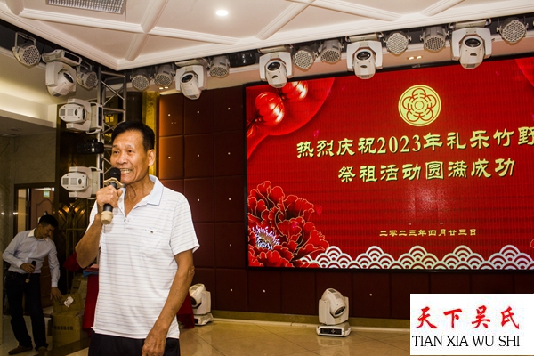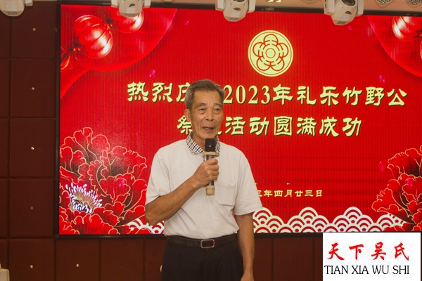 泰伯基金会、珠三角宗亲会秘书长吴昌禄代表泰伯基金会致词说,祝礼乐吴竹野公联谊会祭祖圆满成功,要弘扬至德精神,凝聚宗亲,同心协力发扬光大吴氏家族的传统美德。祝大家身体健康,家庭幸福。南雄珠玑巷泰伯后裔联谊会吴峰会长致词祝2023年礼乐吴氏竹野公祭祖活动圆满成功。传承吴文化,至德精神永流芳,为中华民族的伟大复兴和进步做出更大贡献。祝大家身体健康,万事如意。