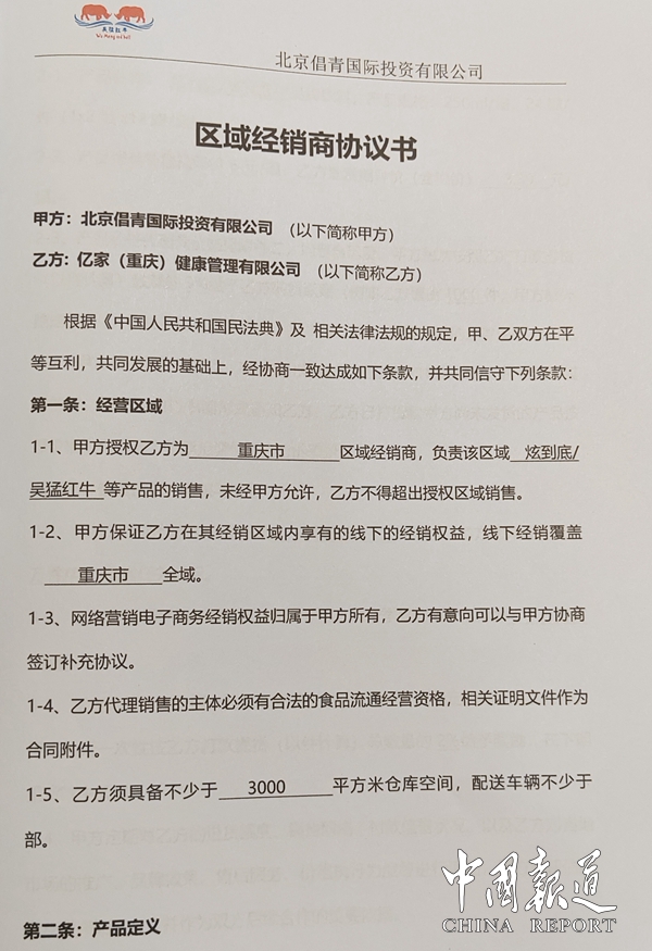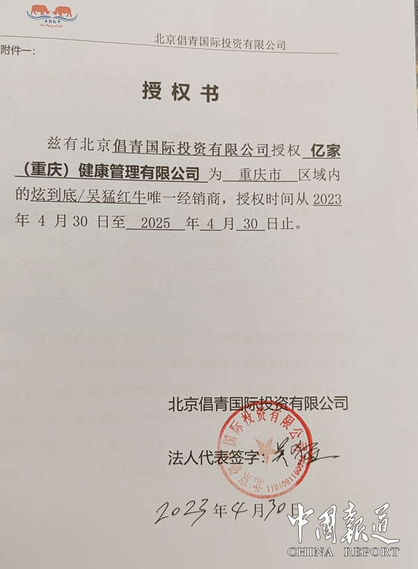 中国报道讯(吴蜀丰报道)4月30日,亿家(重庆)健康管理有限公司与吴猛红牛创始人、北京昌青投资有限公司在广东省河源市和平县吴猛红牛生产基地正式签定战略合作协议。据《区域经销协议》规定,由亿家(重庆)健康管理有限公司全权负责四川省和重庆市地区吴猛红牛销售总代理权。