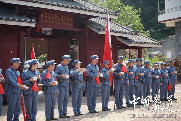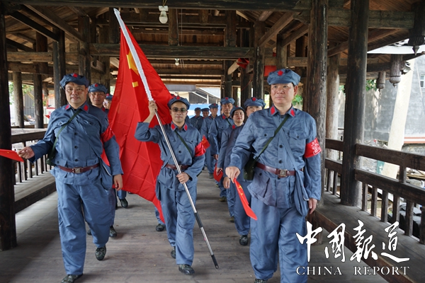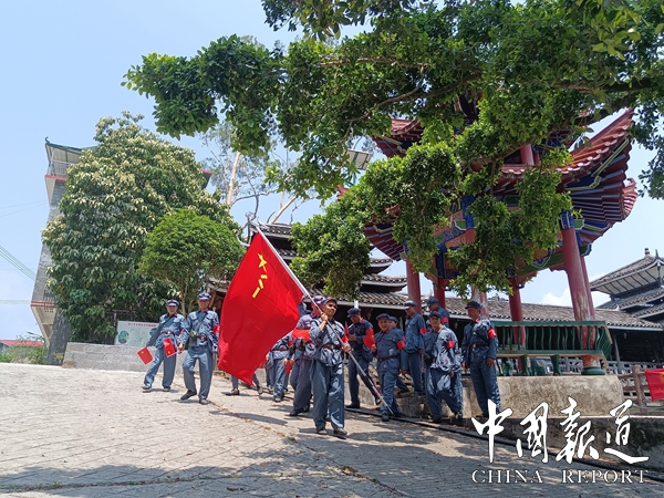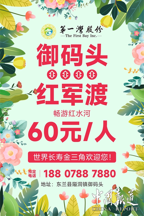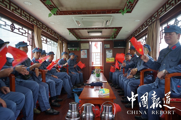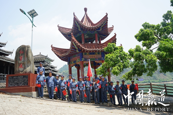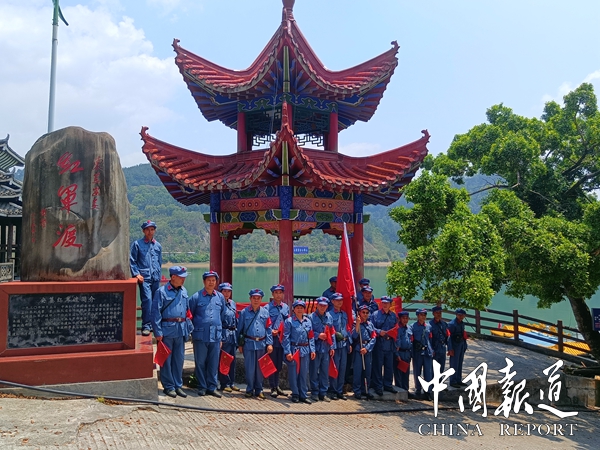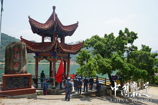 中国报道讯 (通讯员 岑福山 覃 源 韦启阳)5月6日上午,伟人邓小平在广西东兰领导革命曾五渡红水河的安篓红军渡遗址斜对面,广西东兰县隘洞御码头,红色高大的《将军乡一号》和《第一湾一号》游船上,军旗飘扬,军歌嘹亮,统一着红军服装的广西第一湾国际旅游股份有限公司部分员工,随着国旗的升起,他们在这里举行隆重的坐红船寻伟人足迹旅游线路启动仪式。
