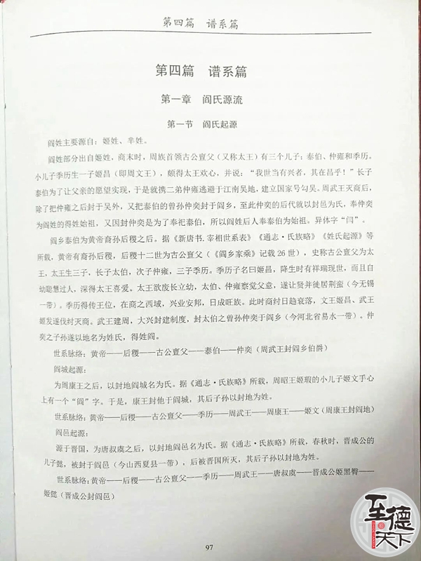 至德天下网讯 根据主编《中华阎氏通谱》的阎政、阎晓飞、阎宝仲等八位同志查阅历史档案,调研考察全国各地的资料,对阎姓的来龙去脉理清了眉目。据《新唐书》记载:阎氏家族乃黄帝之后裔。黄帝至周武五间的子孙姓“姬”。武王伐纣灭商建西周。武王封泰伯的曾孙仲奕于阎乡为伯爵,仲奕的后代以地为姓,姓于“阎”。