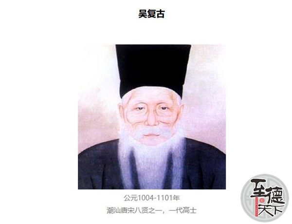 吴复古,生于北宋真宗景德元年(1004),逝于徽宗建中靖国元年(1101)。汕头市龙湖区渔洲乡延陵居委(时为海阳县蓬州都,南宋绍兴10 年 前 还未复置揭阳县)人。他的父亲吴宗统,曾官拜翰林侍讲,世居潮州。吴复古自幼聪颖,任侠好义,以博学多才、精通经典,被荐举为孝廉,宋神宗年间被封为皇宫教授。他治学严谨,虽出入官宦门庭而刚直不阿,深得一代鸿儒司马光韩琦等的器重。学士苏东坡与他交为挚友。因吴复古厌恶宫场上的尔虞我诈,淡泊仕途,不久,以孝养为辞,上表告退。