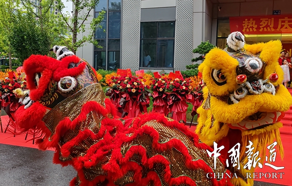 祝贺条副,花蓝,精彩纷呈的舞狮表演,鼔声如雷的腰鼓声,剪彩仪式活动现场喜气洋洋,张灯结彩,热闹氛围浓厚。