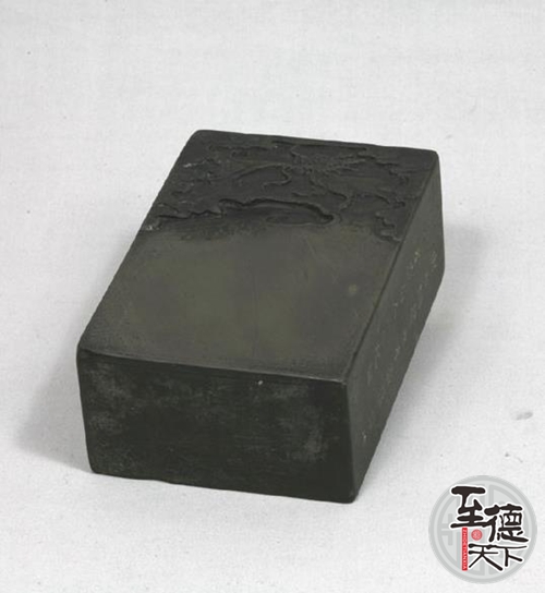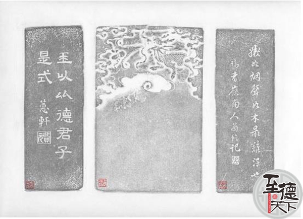 此砚左侧壁亦镌刻有一铭:“玉以比德,君子是式”。大意是说,用这方象玉一样的砚台来比喻道德,是君子学习的模范。铭款“蕙轩”。蕙轩者,名吴嘉汉,字虞三,号蕙轩,江苏如皋人,善画工书,尤精兰竹,常游京师,与朱舒云等书画名家齐名。