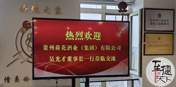 5点50分,贵州遵义途径南京的航班MU2763正点到达,在机场负责接待贵宾的服务小姐引领下,吴光才、吴和洋一行走进贵宾厅,大家进行了短暂的交流并合影留念!然后乘车抵达沈阳知名酒店文体路文安西巷店,酒店的正门显示屏滚动播放“热烈欢迎茅台荷花集团吴光才一行抵达沈阳参观考察”。副会长吴金龙在酒店门口恭候,接风晚宴在热烈欢快的气氛中举行。