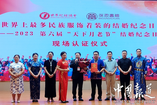 在活动现场,世界至徳总会副主席、保君书院创始人燕保君教授以视频方式发表热情洋溢地开幕词,燕保君介绍,从2018年到2022年,保君书院举办了五届天下月老节相亲活动,有好多家庭都尝到了这个文化给带来的成果,原来不愿意正式结婚的,不愿意生育的,通过参加月老节活动,以及参加活动中开展的婚前指导和婚后疏导课程,都愿意举办一次正式的婚礼,也愿意生儿育女,实现血脉传承,带来更多的新生力量!100对着少数民族服装夫妻结伴上台领证,世界纪录协会认证官张健公布认证结果及丰富多彩的文艺节目演出为第六届“天下月老节”划上完美句号。