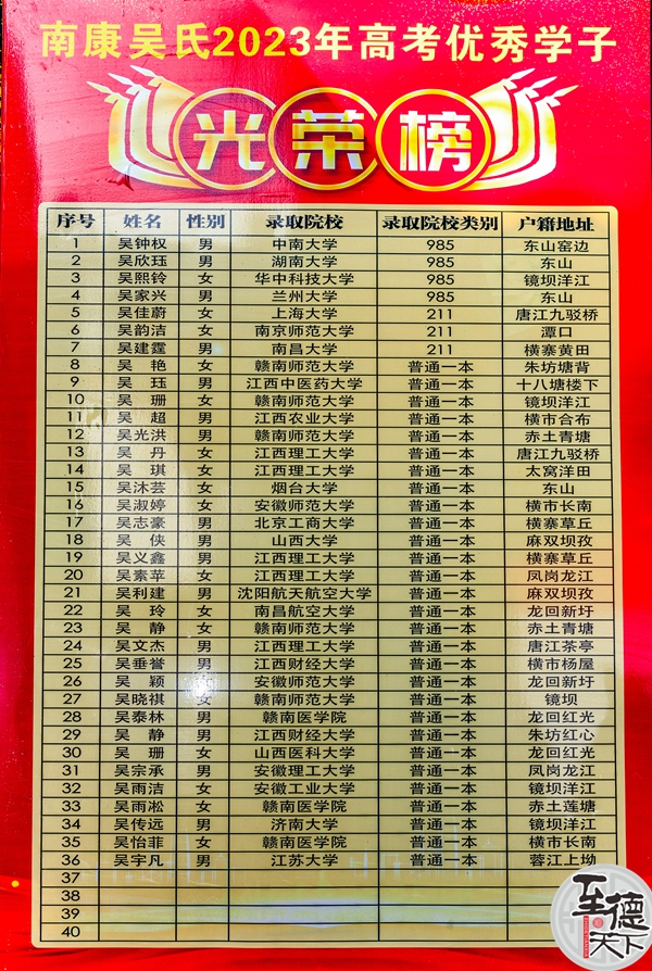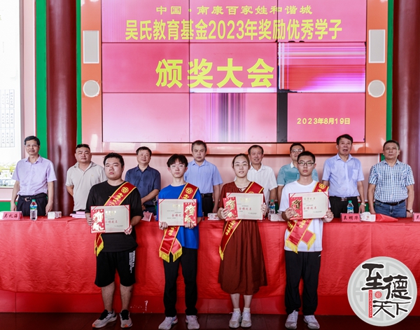 至德天下网讯(吴述东吴贻文赣州南康报道)春风得意马蹄疾,最是金榜题名时。2023年是中国传统农历的癸卯兔年,江西省赣州市南康区吴氏喜获一本以上的优秀学子36人,其中,考取985院校的4人、考取211院校的3人、其他院校的29人。为了弘扬吴氏文化,传承至德精神,有效激励吴氏学子勤学上进,不负韶华,在南康吴氏宗亲联谊会、吴氏教育基金会的精心安排下,2023年8月19日,在巍峨壮观的南康百家姓和谐城隆重召开了南康吴氏2023年高考优秀学子颁奖大会。