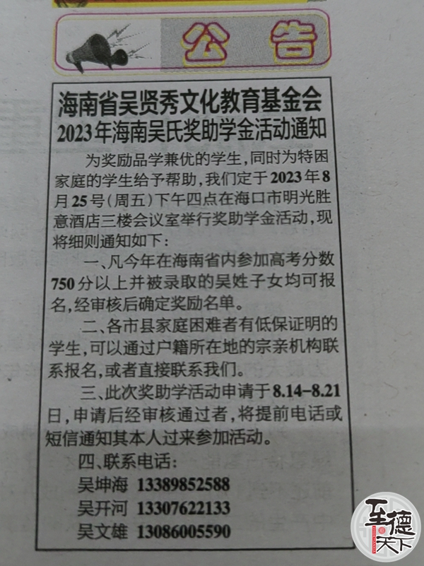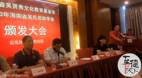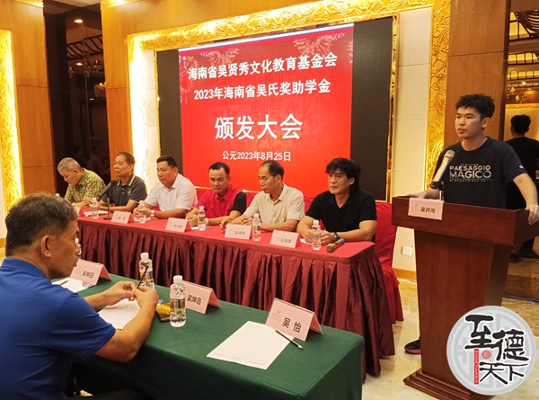 至德天下网(吴开河海南报道)8月25日下午,海南省吴贤秀文化教育基金会在海口市明光胜意酒店会议厅举办2023年海南吴氏奖助学金颁发大会,为品学兼优的学生给予支持与鼓励,同时为特困家庭的学生给予扶持帮助,真正体现吴氏人支持文教、敦宗睦族、互帮互助的人文关怀。奖助学金发放对象包括今年本省参加高考分数在750分以上并被录取的全省吴姓学子经报名审核后确定其奖励者,对家庭困难且有低保证明者,报名审核后确定其助学者。