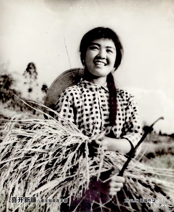 中国报道讯(通讯员郑瑞舜)《喜开新镰》——重庆知青蒋素珍。一年好景君须记,正是橙黄橘绿时。艳阳高照,秋风送爽。又是一年丰收季。一层层金黄的梯田叠加而上,犹如登天的金光大道直达天际。今年风调雨顺,五谷丰登。喜看稻菽千重浪,遍地英雄下夕烟。让我想起五十年前,1972年8月我与县政府廖长明(后任名山管委会主任)去丰都县永兴乡拍农业学大寨。赶场天在场上见一梳着麻花辫的女知青晒得黢黑,主动搭讪。后去知青家煮粥吃后去割谷。