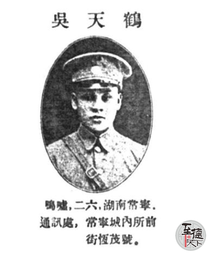 吴天鹤,(1898-1970) 黄埔军校第三期步科毕业。别字鸣虚,湖南常宁人。陆军大学将官班甲级第三期、中央训练团警宪班毕业。历任国民革命军第三师排、连长,中央宪兵一团连、营、团长,北平市公安局科长。抗日战争爆发后,任宪兵司令部第四团少将团长,宪兵司令部人事处长。1942年11月陆大将官班毕业,历任湘鄂川黔边绥靖公署宪兵司令部参谋长,联勤总部宪兵副司令。1948年9月授陆军少将。1949年12月在成都起义,后入人民解放军西南军区高参室工作,后任西南步兵学校教员,重庆市政协委员。1970年春病逝。