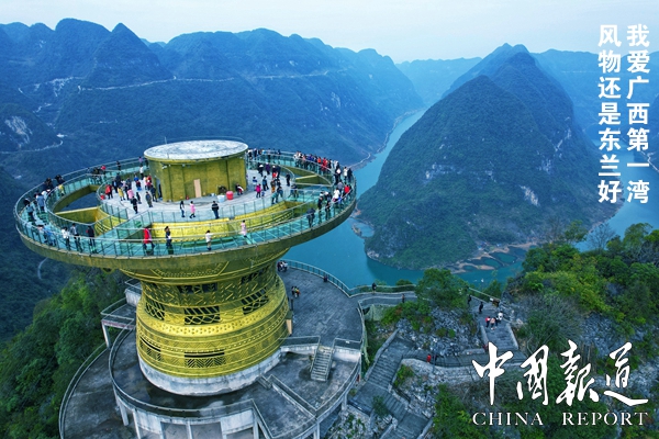 而在国家4A级景区红水河第一湾,广西红水河在流经东兰县板文村境内的一个地方拐了一个大弯,形成一个"U"字型的大峡谷,其河道狭窄,两岸高山耸立,直插云天,与水面落差数百米,峡谷间云雾缭绕,是寻奇、览胜、探幽难得的景观。游客赏着山石百态,览河天胜景,纷纷拍照留念。不少游客表示:“这里风景宜人,空气清新,站在山顶铜鼓玻璃栈道欣赏河天一色,让人身心感到愉悦,是个值得打卡的景点。”