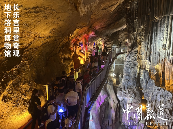 在国家4A级景区长乐宫,游客在工作人员引导下,有序排队进入景区。景区内,游客沿着铺有红地毯的步道,在集喀斯特地貌峰丛洼地、峰林平原、孤峰与石林、天坑、天窗等山景于一身的世界罕见的溶洞,洞内沉积物流石坝、钟乳石、石笋、石瀑布,还有均匀分布的莲花盆、石幕、石旗、石花等上忆年的自然景观。